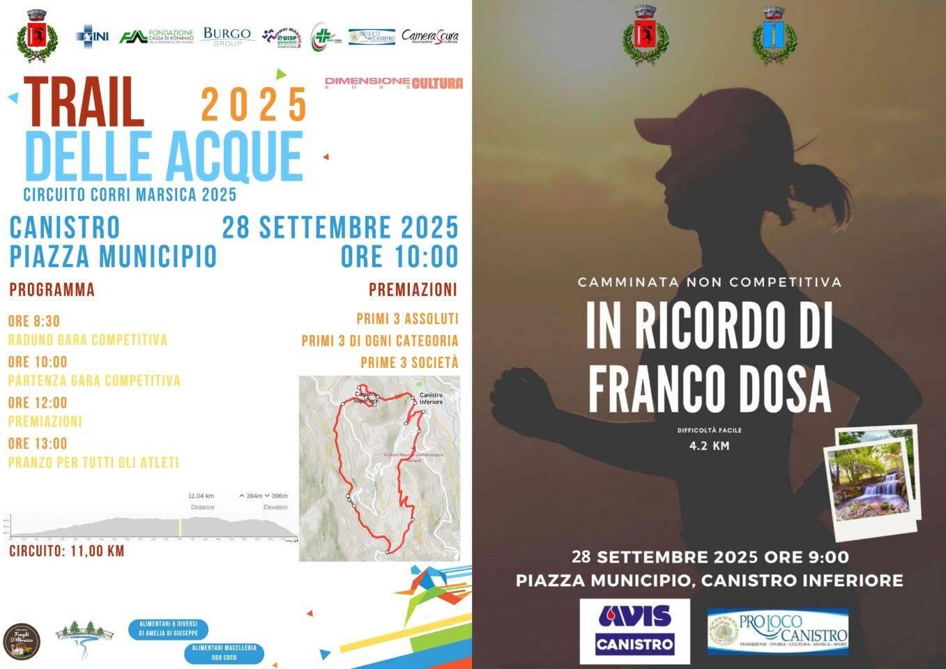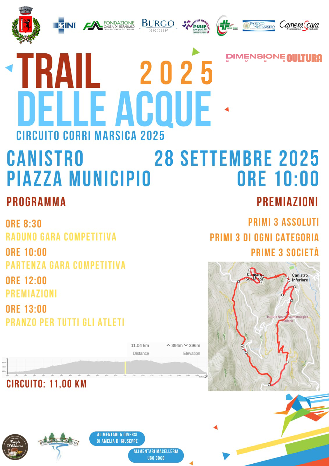 Il Comune di Canistro pubblica i dettagli ufficiali relativi alla Quarta edizione del "Trail delle Acque".Inserito nel programma "Dimensione Cultura 2025” la corsa, tra la natura incontaminata del nostro territorio, attraverserà il borgo storico di Canistro Superiore, per un totale di circa 11 km.Come ogni anno avrà luogo, attraverso una camminata non competitiva organizzata congiuntamente con il Comune di Civitella Roveto, la commemorazione del compianto Franco Dosa.La camminata partirà nello stesso momento della gara competitiva condividendo, tutti insieme, parte dello stesso tracciato.A fine gara sarà offerto il pranzo a tutti gli atleti.