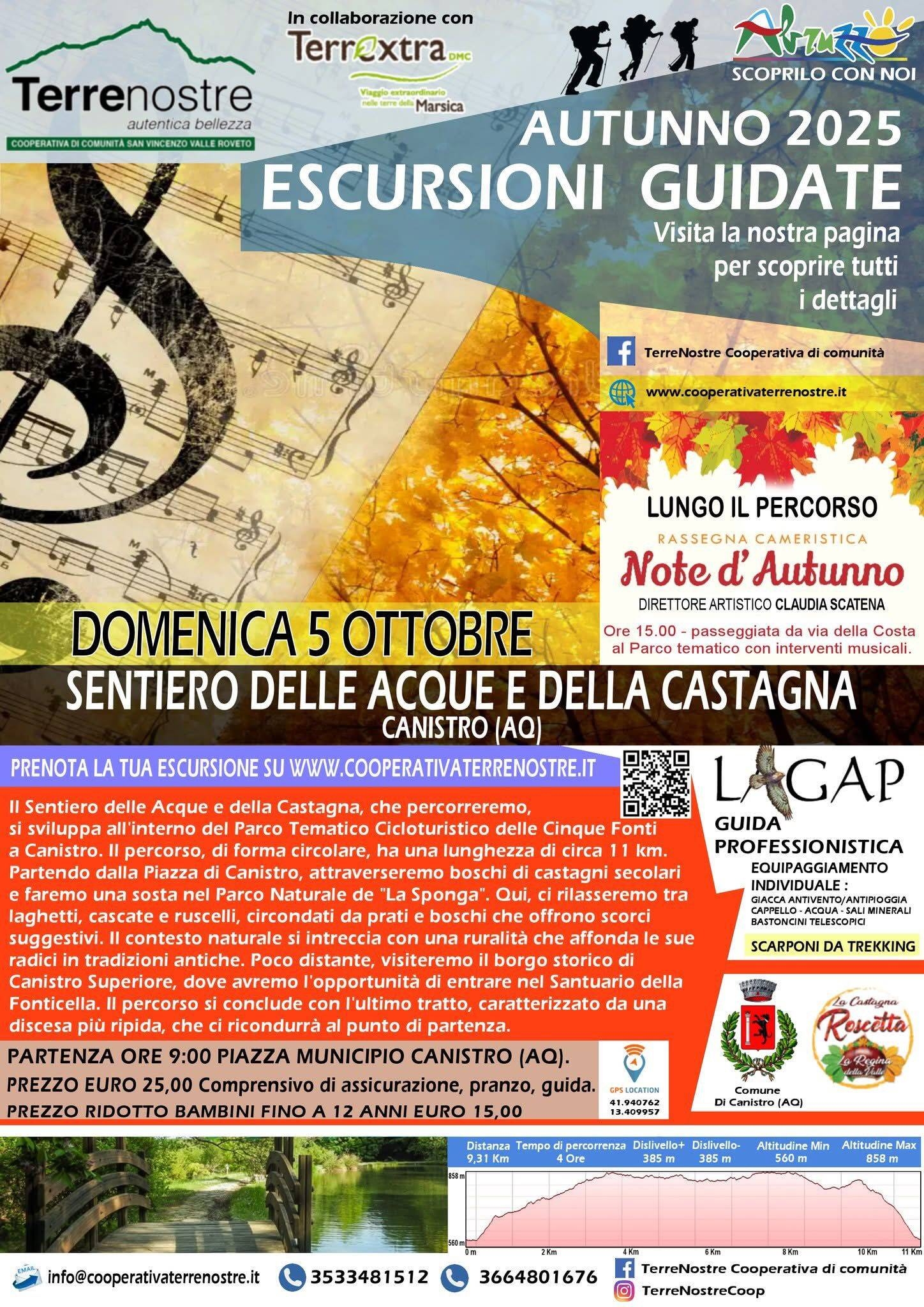 Il Sentiero delle Acque e della Castagna, che percorreremo, si sviluppa all'interno del Parco Tematico Cicloturistico delle Cinque Fonti a Canistro. Attraverseremo boschi di castagni secolari e faremo una sosta nel Parco Naturale de "La Sponga".