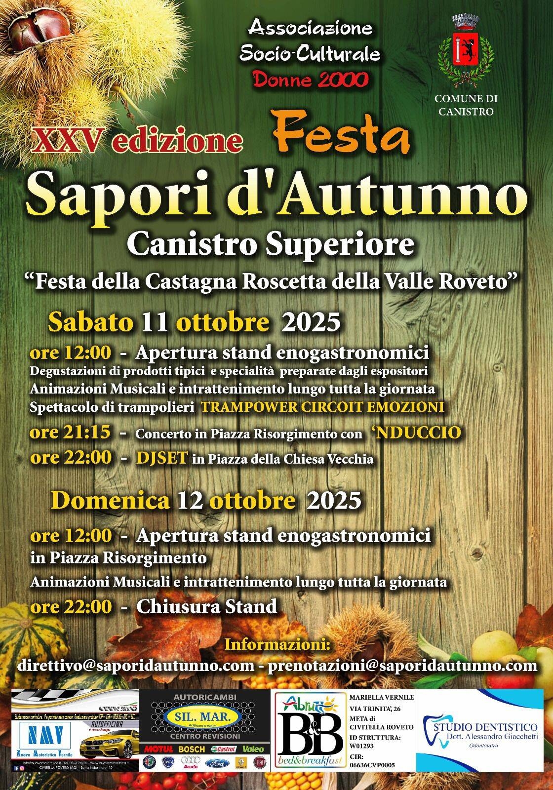La “Festa Sapori d’Autunno”, organizzata dall’Associazione “Donne 2000” con il patrocinio del Comune di Canistro, è una mescolanza di colori e suoni, rievocazione di antichi mestieri, pasti tipici, usanze e costumi locali. La festa vuole riportare alla memoria antiche tradizioni, sapori e odori ormai smarriti e ricordare che il borgo è nato in mezzo ad un bosco di castagne. Gli antichi abitanti di Canistro disboscarono maestosi castagneti per edificare il paese. I visitatori si troveranno immersi nella scenografia dei vicoli e piazzette dell’incantevole centro storico medioevale di Canistro Superiore, dalla tradizionale forma a testuggine, che troneggia sull’intera Valle Roveto come una sentinella.